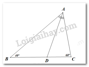 Câu 4: Cho \(\Delta ABC\) có AD là tia phân giác, \(\hat B = {40^\circ },\hat C = {60^\circ }\). Khi đó số đo của \(\widehat {BAD}\) là :