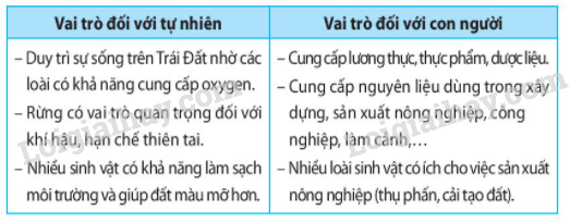 Trình bày vai trò của đa dạng sinh học đối với tự nhiên và với con người bằng cách hoàn thành thông tin vào bảng sau: