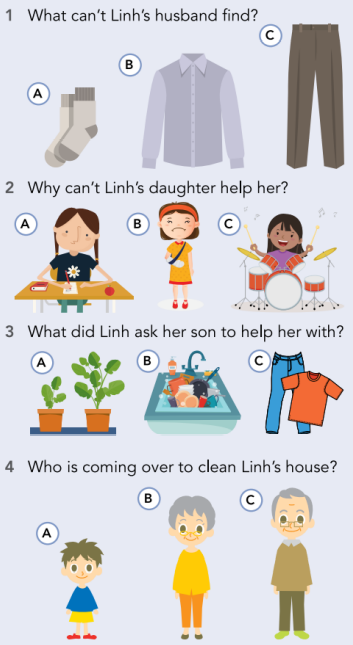 1. Complete the sentences with the words in the box. 2. Complete the phrases with do, make, or wash. 3. Complete the sentences with the correct verb tense. 4. Complete the sentences with so or such. 5. Listen to two people talking about household chores. Choose the correct answer. 6. Write an email (120-150 words) to a foreign friend. You should: