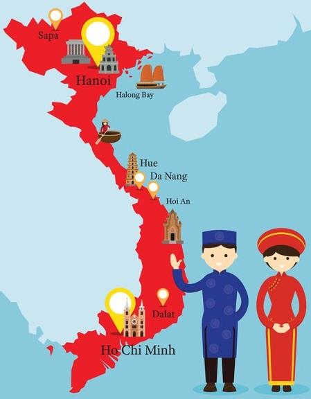 Việt Nam nổi tiếng với các địa danh. Vịnh Hạ Long là một vịnh tuyệt vời ở tỉnh Quảng Ninh. Vịnh được rải rác với 1.600 hòn đảo đá vôi và đảo nhỏ và có diện tích hơn 1.500 km vuông. Khu vực đặc biệt này đã được UNESCO công nhận là Di sản Thế giới vào năm 1994. Đà Lạt là một thành phố xinh đẹp thuộc tỉnh Lâm Đồng. Điểm tham quan đặc trưng của Đà Lạt là những rừng thông và những con đường ngoằn ngoèo đầy hoa cúc vạn thọ và mai dương vào mùa đông.