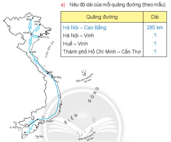 a) Quan sát bản đồ để xác định quãng đường Hà Nội – Vinh, Huế – Vinh, Thành phố Hồ Chí Minh – Cần Thơ.