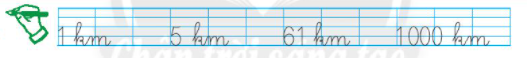 Em quan sát ví dụ mẫu rồi viết lại các độ dài trên với đơn vị ki-lô-mét vào vở.