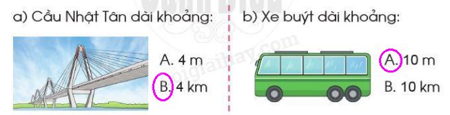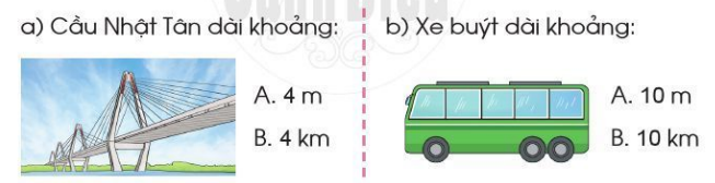 Quan sát cây cầu, xe bus trong thực tế và khoanh vào đáp án thích hợp.