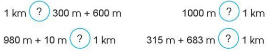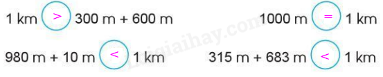 b) Tính nhẩm kết quả các phép cộng, áp dụng cách đổi 1 km = 1000 m rồi so sánh hai vế.