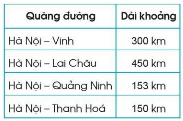 Chọn số đo độ dài thích hợp. a) Tính: 200 km + 140 km 160 km – 60 km 2 km x 9 45 km : 5 Đọc bảng sau rồi trả lời các câu hỏi: a) Trong các tuyến đường từ Hà Nội đi các tỉnh này, tuyến đường nào dài nhất? b) Từ Hà Nội đi Quảng Ninh xa hơn hay từ Hà Nội đi Vinh xa hơn?