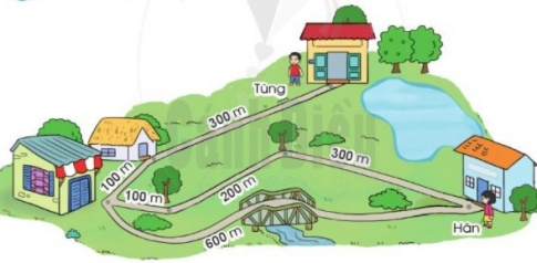 Quãng đường từ nhà Tùng đến nhà Hân dài 300 m + 100 m + 600 m = 1000 m = 1 km