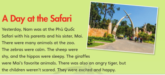 Hôm qua, Nam đã ở Vườn thú Phú Quốc cùng bố mẹ và em gái của cậu ấy Mai. Có rất nhiều động vật ở sở thú. Những con ngựa vằn rất bình tĩnh. Cừu nhút nhát, và hà mã buồn ngủ. Hươu cao cổ là loài động vật yêu thích của Mai. Cũng có một con hổ giận dữ, nhưng bọn trẻ không sợ. Họ đã rất phấn khích và hạnh phúc.