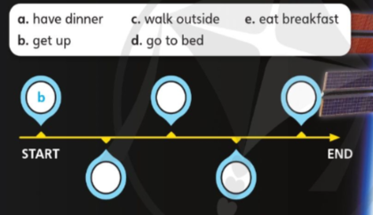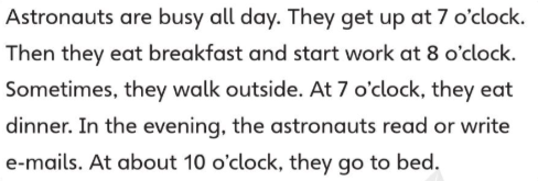 Astronauts are busy all day. They get up at 7 o’clock. Then they eat breakfast and start work at 8 o’clock. Sometimes, they walk outside. At 7 o’clock, they eat dinner. In the evening, the astronauts read or write emails. At about 10 o’clock, they go to bed.