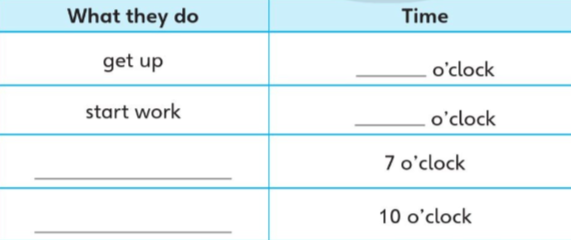 Listen and read. Look. Read again and write. Read again. Complete the table.