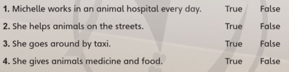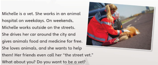 Michelle is a vet. She works in an animal hospital on weekdays. On weekends, Michelle works outside on the streets. She drives her car around the city and gives animals food and medicine for free. She loves animals, and she wants to help them! Her friends even call her “the street vet.” What about you? Do you want to be a vet?