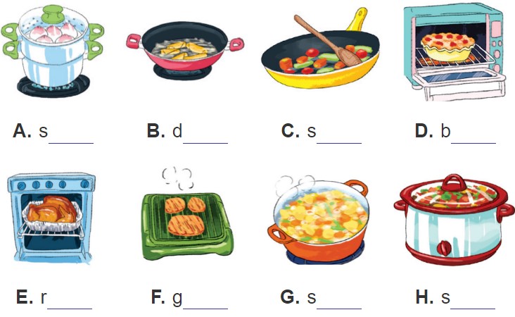 (Viết một động từ về phương thức nấu ăn dưới mỗi bức tranh. Ký tự đầu tiên đã được cho sẵn.)