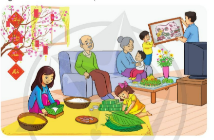 a) Trong tranh là hình ảnh gia đình đang sửa soạn tết.