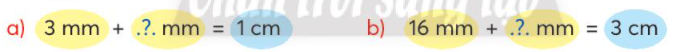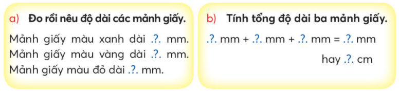 a, Các em lấy thước thẳng đo độ dài từng mảnh giấy rồi điền kết quả vào dấu chấm hỏi