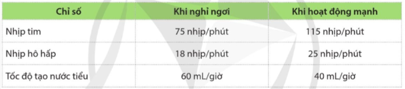 Từ bảng trên, ta thấy lúc hoạt động mạnh, nhịp tim và nhịp hô hấp đều tăng lên và tốc độ tạo nước tiểu giảm so với khi nghỉ ngơi.
