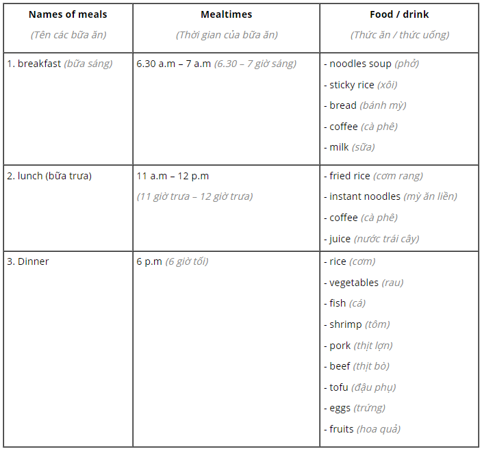 – names of main meals and mealtimes (tên các bữa ăn chính và giờ ăn)