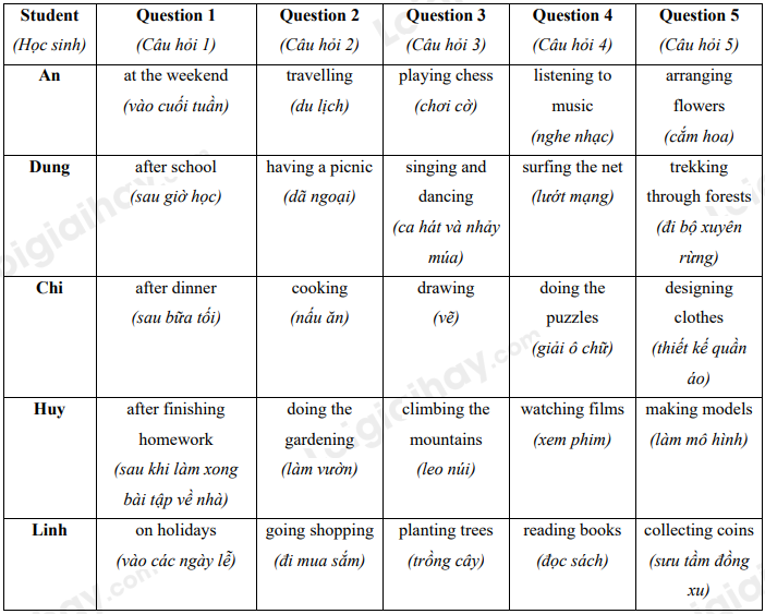 (Thu thập các câu trả lời. Sử dụng bảng dưới đây.)
