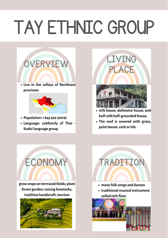 Today, my group will introduce about the Tay people, an ethnic group which has been presented for over three millennium in Vietnam. The Tay people mostly live in valleys of Nothern provinces like Quang Ninh, Bac Giang, Lang Son, Cao Bang, Bac Kan, Thai Nguyen, Ha Giang, Tuyen Quang to Lao Cai and Yen Bai. According to the census on the 53 ethnic minorities as announced on April 1, 2019, the total population of the Tay ethnic group is 1,845,492. The Tay people speak the subfamily of Thai-Kadai people.