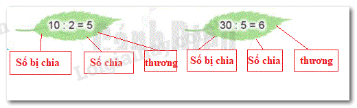 Quan sát ví dụ mở đầu trong SGK rồi nêu số bị chia, số chia, thương trong các phép tính trên.