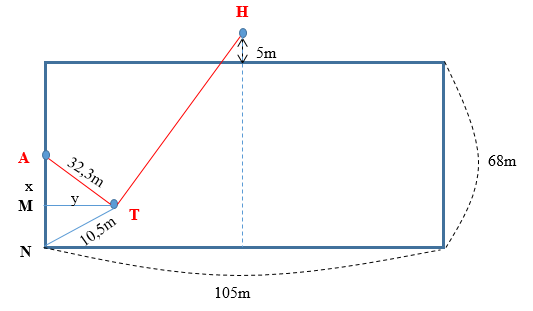 \(\begin{array}{l}M{N^2} + M{T^2} = N{T^2} \leftrightarrow {\left( {AN – AM} \right)^2} + M{T^2} = N{T^2}\\ \leftrightarrow {\left( {\dfrac{{68}}{2} – x} \right)^2} + {y^2} = 10,{5^2}{\rm{        }}\left( 2 \right)\end{array}\)