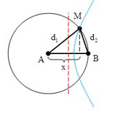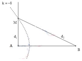 Vì n = 1 =>  m là số lẻ. Trên hình, theo đề ta có :\(\left\{ \begin{array}{l}{d_1} + {d_2} > AB\\4\lambda  \le AB < 5\lambda \end{array} \right.\left( 2 \right)\)