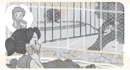 Mẹ của tôi và tôi bây giờ đang ở sở thú. Chúng tôi có thể nhìn thấy rất nhiều động vật. Chúng tôi có thể nhìn thấy một con hổ. Nó đang trèo cây. Nhìn kìa! Có một con vẹt ở đằng kia. Nó đang đếm số. Có nhiều  con công ở đây. Chúng tôi rất thích động vật.