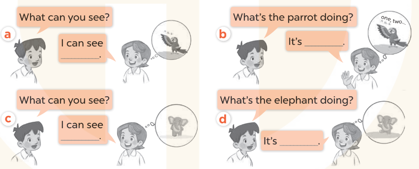 4 – d. What’s the parrot doing? (Con vẹt đang làm gì vậy?)
