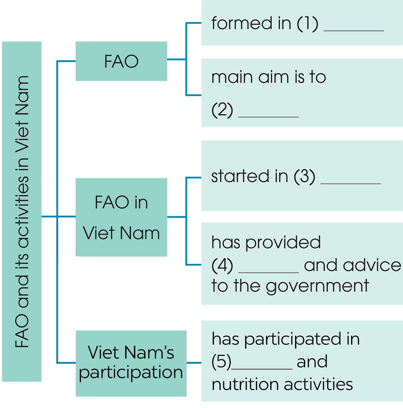 1. Listen and complete the conversation with the expressions in the box. Then practise them in pairs. 2. You want to invite a friend to join you in an activity. Work in pairs. Make similar conversations like the ones in 1. Use the useful expressions below to help you. 1. Read the text below and complete the diagram. 2. Work in pairs. Use the diagram in 1 to talk about FAO and its activities in Viet Nam.