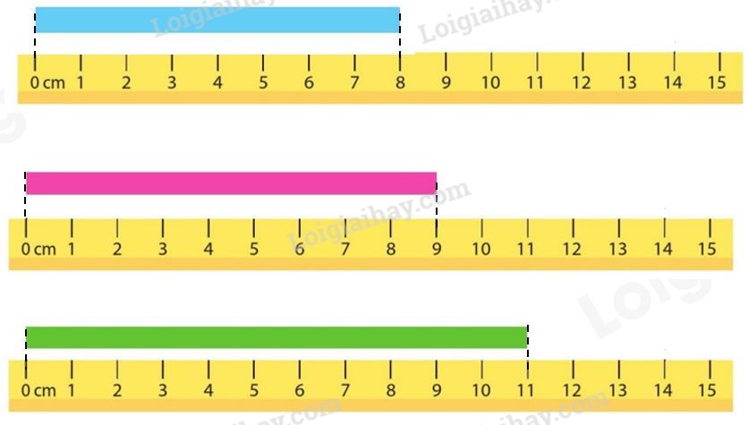 a) Dùng thước có vạch chia xăng-ti-mét để đo, rồi viết số đo độ dài của mỗi băng giấy vào chỗ chấm: