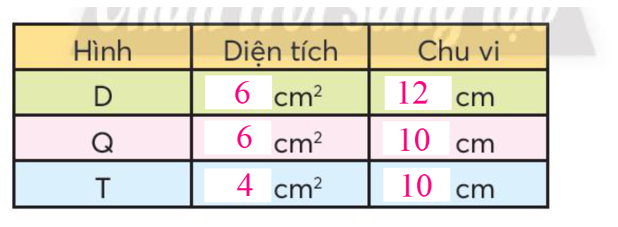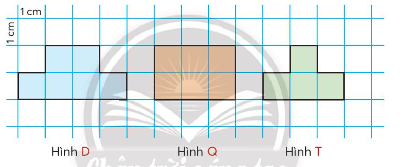 – Hình Q có 6 ô vuông. Diện tích hình Q là: 6 cm2