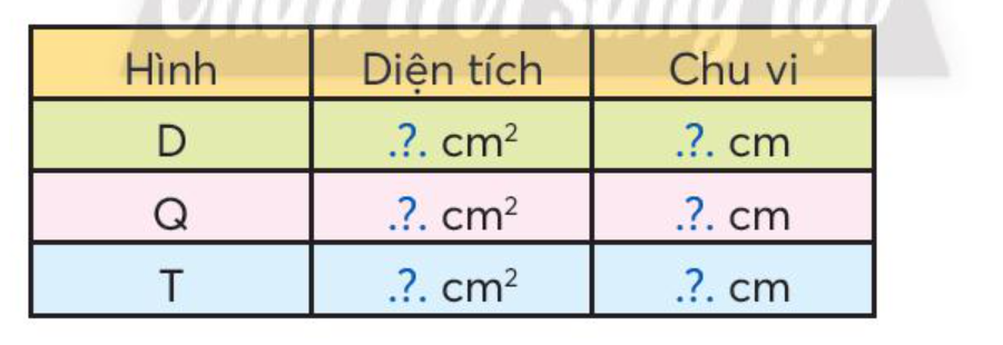 • Hình Q và hình T có chu vi bằng nhau nhưng diện tích khác nhau.