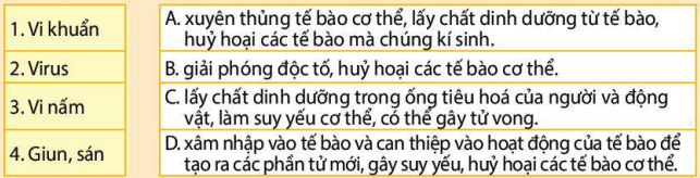 1. Ghép đúng tác nhân sinh học (1, 2, 3 hoặc 4) với cách thức gây bệnh (A, B, C hoặc D).