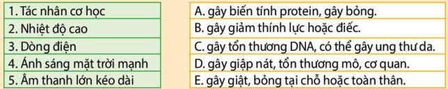 Ghép đúng tác nhân vật lí (1, 2, 3, 4 hoặc 5) với cách thức gây bệnh (A, B, C, D hoặc E).