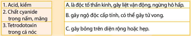 Ghép đúng tác nhân hóa học (1, 2 hoặc 3) với cách thức gây bệnh (A, B hoặc C).