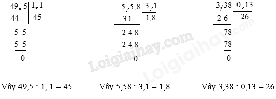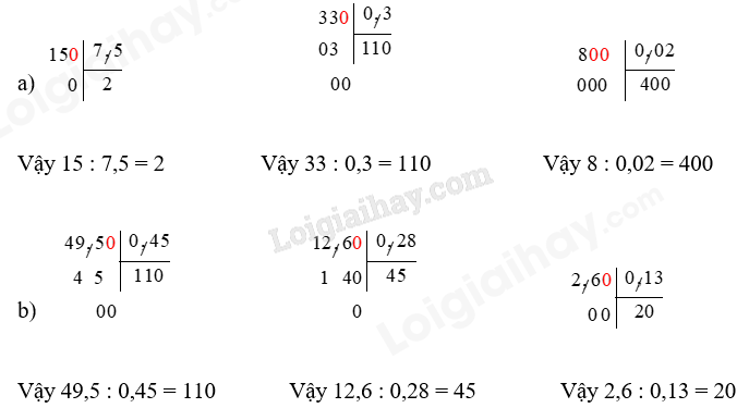 a) Đếm xem có bao nhiêu chữ số ở phần thập phân của số chia thì chuyển dấu phẩy ở số bị chia sang bên phải bấy nhiêu chữ số rồi tính kết quả.