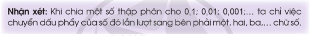 Nhận xét: Khi chia một số thập phân cho 0,1 ; 0,01 ; 0,001; ta chỉ việc chuyển dấu phẩy của số đó lần lượt sang bên phải một, hai, ba, … chữ số.