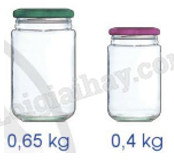 b) Chị Huế muốn đựng 2,6 kg bột đậu xanh vào các lọ thủy tinh. Có hai loại lọ như hình bên. Theo em, nếu chỉ chọn lọ loại 0,65 kg thì cần ít nhất mấy lọ? Nếu chỉ chọn lọ loại 0,4 kg thì cần ít nhất mấy lọ?