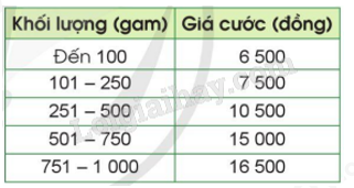 Em hãy giúp cô nhân viên bưu điện tính tiền cho hai khách hàng gửi bưu phẩm từ Hà Nội đến Thành phố Hồ Chí Minh. Biết rằng người thứ nhất gửi gói bưu phẩm cân nặng 0,6 kg và người thứ hai gửi gói bưu phẩm cân nặng 0,25 kg.