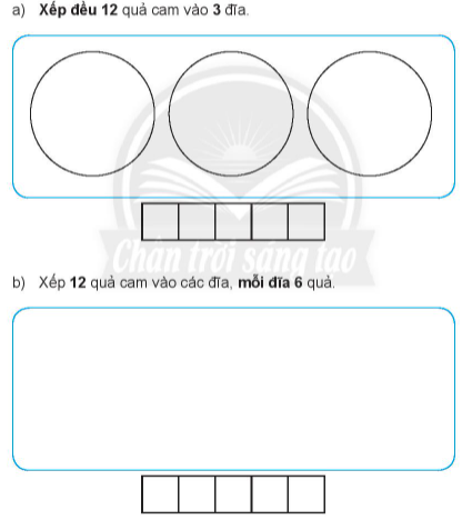 b) Xếp 12 quả cam vào các đĩa, mỗi đĩa 6 quả ta thực hiện phép chia 12 : 6 = 2