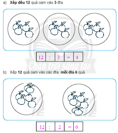 – Để xếp 12 quả cam vào các đĩa, mỗi đĩa 6 quả ta thực hiện phép chia 12 : 6