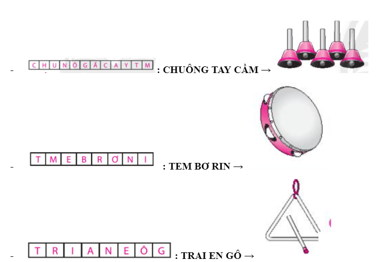 Em hãy sắp xếp các chữ cái lại với nhau cho đúng tên nhạc cụ, sau đó nối tên với hình ảnh nhạc cụ.