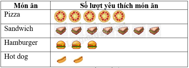 Số lượt yêu thích các món ăn nhanh của lớp 6A được cho ở biểu đồ tranh như sau: