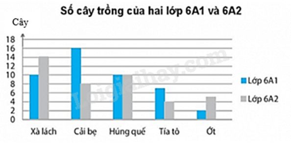 Cho biểu đồ cột kép biểu diễn số cây trồng của 2 lớp 6A1 và 6A2 như sau: