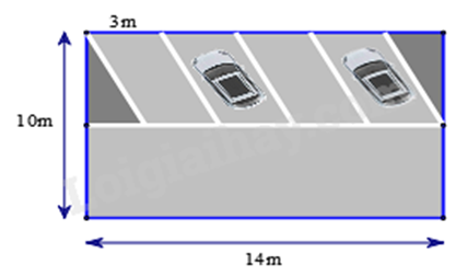Khu vực đậu xe của một cửa hàng có dạng hình chữ nhật với chiều dài 14m, chiều rộng 10m. Trong đó một nửa khu vực dành cho quay đầu xe, hai góc tam giác để trồng hoa và phần còn lại chia đều cho bốn chỗ đậu ô tô (hình bên).