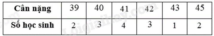 Hãy lập bảng thống kê biểu diễn cân nặng của \(15\) học sinh lớp 6 trên. Dựa vào bảng hãy cho biết có bao nhiêu bạn nặng \(45\) kilôgam?