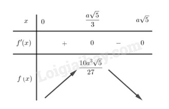 Từ bảng biến thiên ta thấy hàm số \(f\left( x \right)\) đạt GTLN tại \(x = \dfrac{{a\sqrt 5 }}{3}\) và \(f\left( {\dfrac{{a\sqrt 5 }}{3}} \right) = \dfrac{{10{a^3}\sqrt 5 }}{{27}}\)