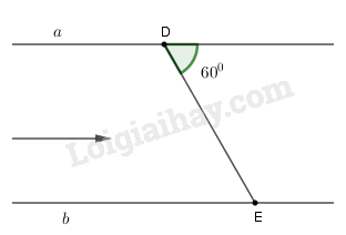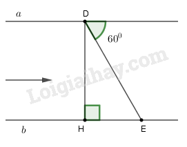 1. Một con thuyền ở địa điểm \(D\) di chuyển từ bờ sông \(a\) sang bờ sông \(b\) với vận tốc trung bình là \(2km/h,\) vượt qua khúc sông nước chảy mạnh trong \(20\) phút. Biết đường đi con thuyền là \(DE\), tạo với bờ sông một góc bằng \(60^\circ .\) Tính chiều rộng khúc sông.