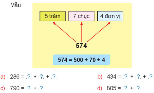 Xác định các số trăm, số chục, số đơn vị rồi viết mỗi số thành tổng các trăm, chục, đơn vị thích hợp.