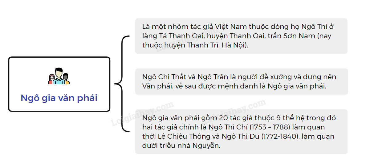 – Ngô gia văn phái gồm 20 tác giả thuộc 9 thế hệ trong đó hai tác giả chính là Ngô Thì Chí (1753 – 1788) làm quan thời Lê Chiêu Thống và Ngô Thì Du (1772-1840), làm quan dưới triều nhà Nguyễn.