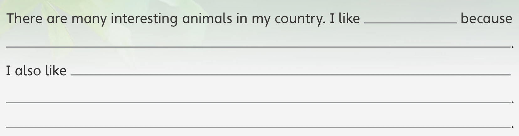 There are many interesting animals in my country. I like dogs because they are smart and loyal. They can help the police in their work. I also like parrots because they are colorful.