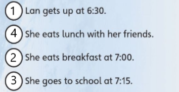 My friend is Lan. He gets up at 5 o’clock every day. She does morning exercises regularly. He goes to school at 6:30.